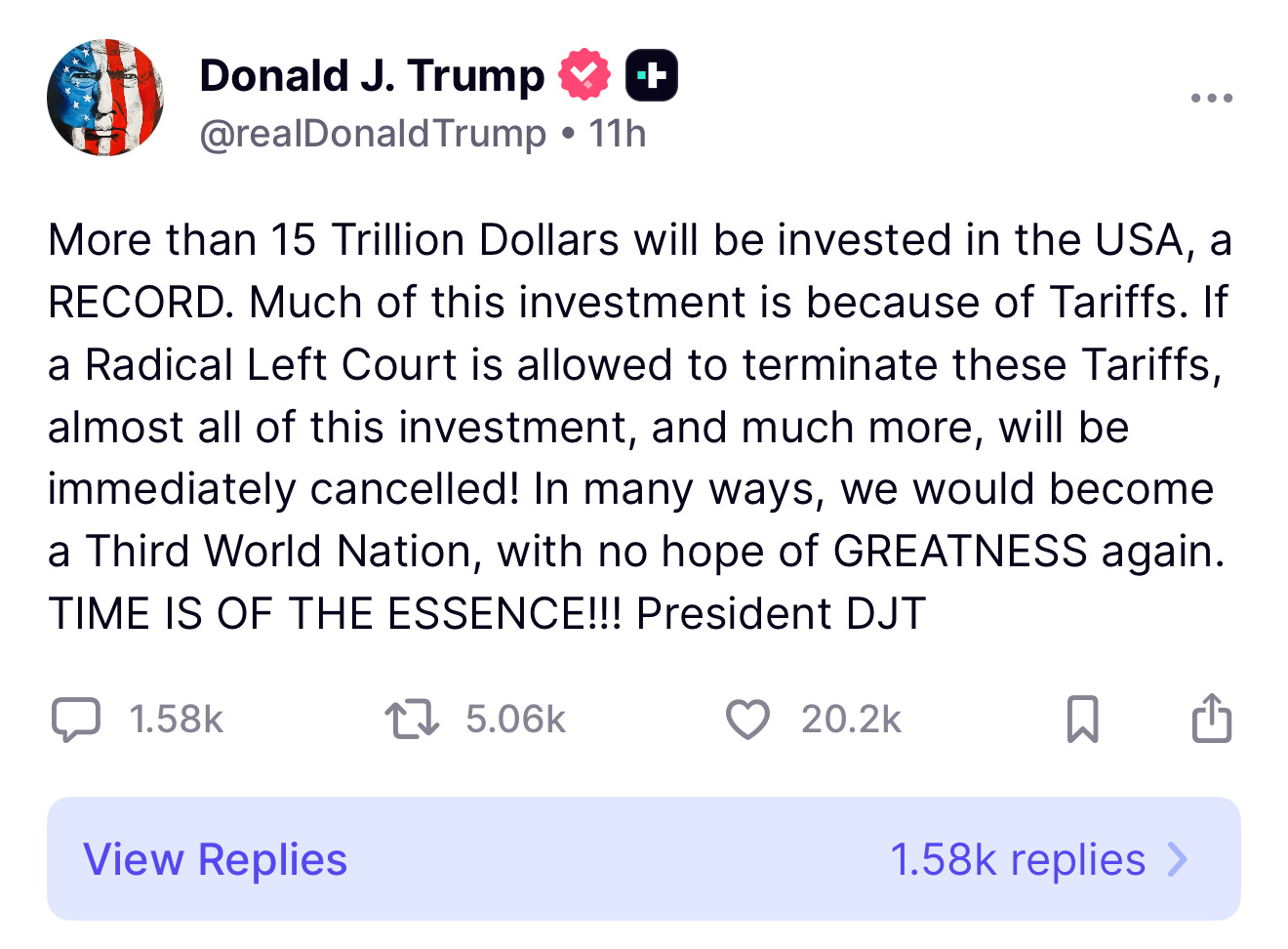 Trump isn’t mincing words. The tariffs are the backbone of America’s economic shield, the engine behind $15 trillion in record investment. He warned Sunday night that if the “radical left court” dares to dismantle them, the U.S. risks collapsing into third-world status — overnight.