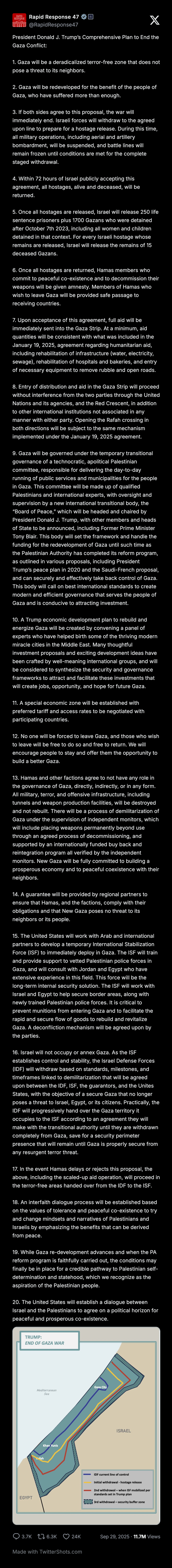 No leaks. No diplomats. No think-tank choreography. Just a 21-point peace plan dropped like a hammer, signed by both sides before the Nobel committee could blink. Israel votes to certify it within hours — hostages out, troops pulled back, bloodshed stopped. The same media that called him “dangerous” now has to report “ceasefire achieved.” The Deep State wanted quagmire. Trump delivered quiet.