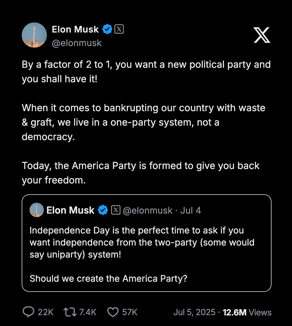 Just a day after polling his X followers about forming a new party, Musk declared the “America Party” officially launched—promising to “give you back your freedom.” The move follows his vocal opposition to President Trump’s tax and spending bill, which Musk slammed as bloated and fiscally irresponsible.