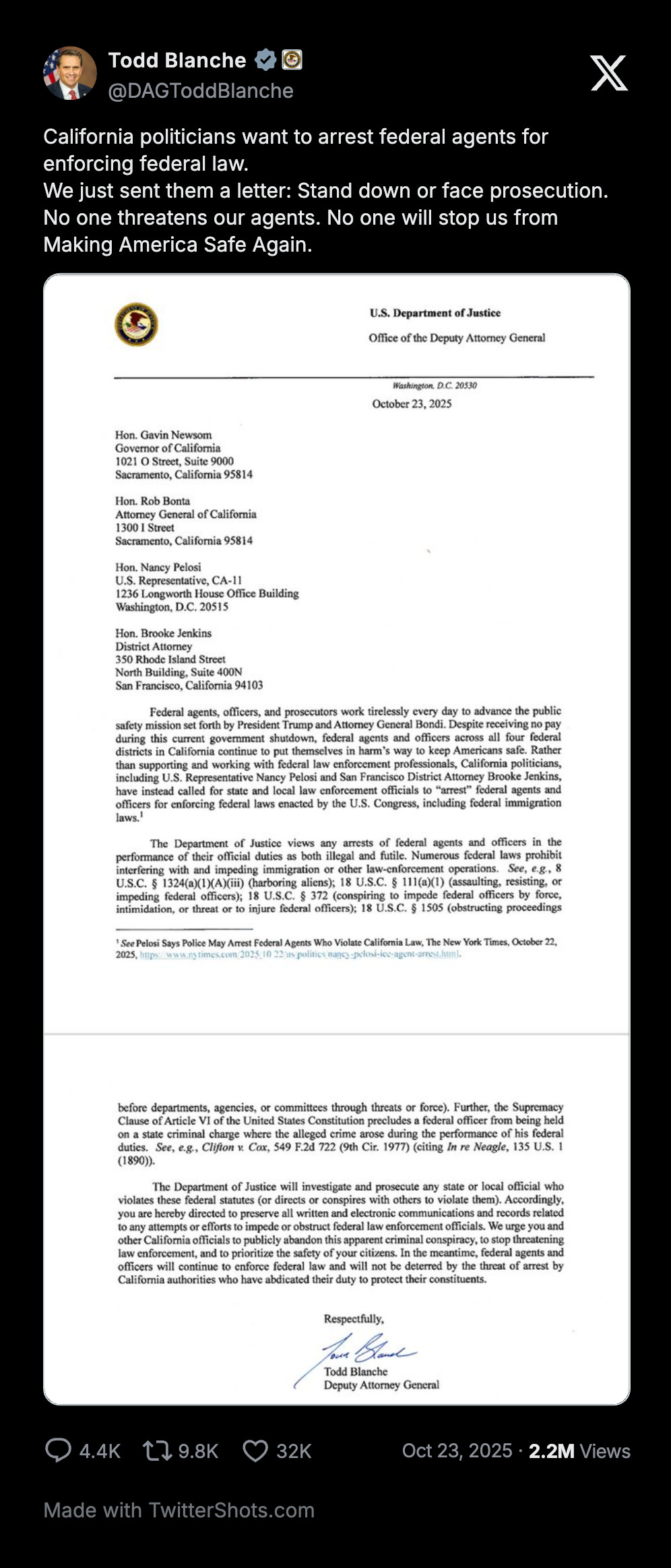 Blanche’s letter wasn’t polite. He accused California officials of a potential criminal conspiracy to obstruct law enforcement and told them to “preserve all communications” for an inevitable investigation. Translation: the DOJ is ready to pounce.