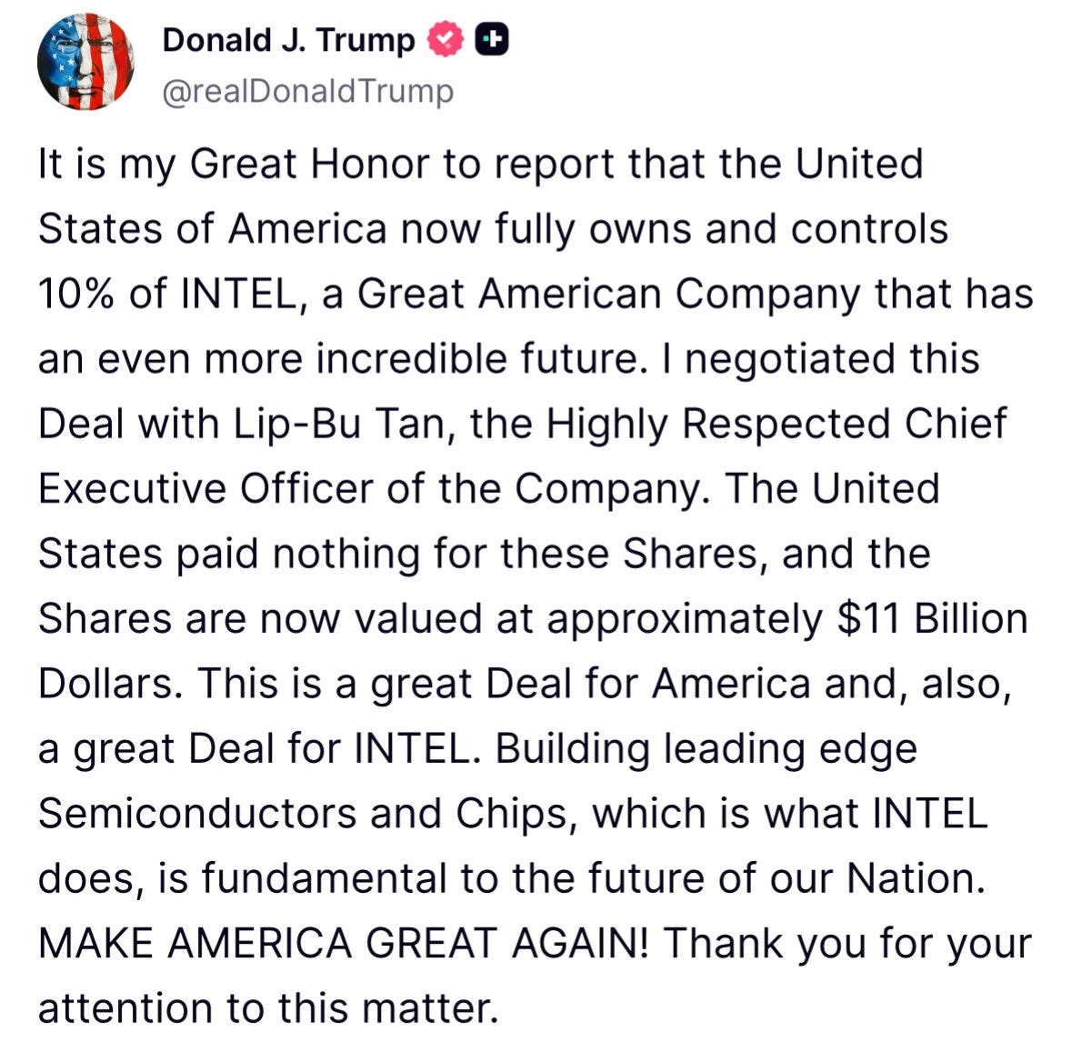 The U.S. government is now a 10% shareholder in Intel. Trump made the bombshell announcement Friday, touting the $8.9 billion equity deal as a “win for America” — and a wake-up call for the private tech world.