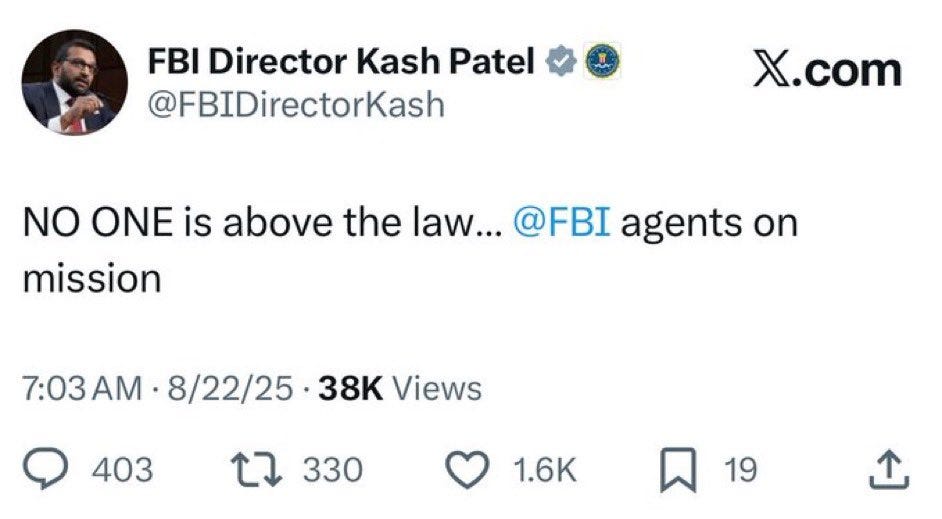 Patel’s FBI is just getting started. A day earlier, he publicly confirmed former FBI Director James Comey “authorized classified leaks while misleading Congress” — a revelation that would’ve been front-page news in a functioning country.