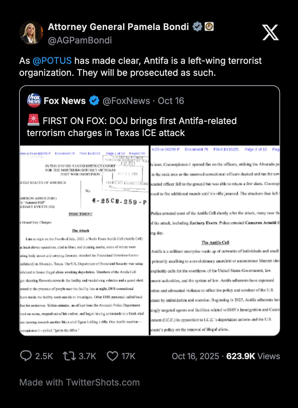 AG Pam Bondi: calling Antifa “a left-wing terrorist organization” in a post on X.