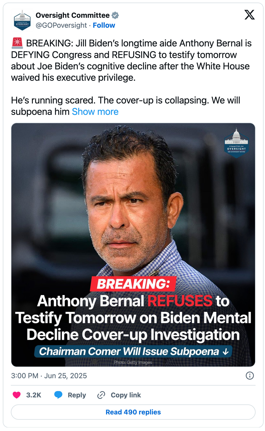 Anthony Bernal, Jill Biden’s chief of staff and the so-called “work husband” of the First Lady, abruptly bailed on scheduled testimony before the House Oversight Committee about Joe Biden’s cognitive decline. His no-show came right after the White House conveniently waived executive privilege, removing his last excuse. Translation? Bernal has everything to hide.