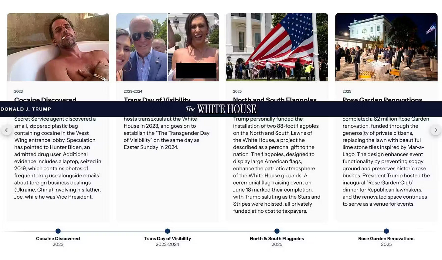 This week, the White House rewired its own history — adding the stains the Left tried to scrub. Clinton’s disgrace. Obama’s radical meetings. Biden’s powder trail. All pinned to the national timeline like museum exhibits of corruption.