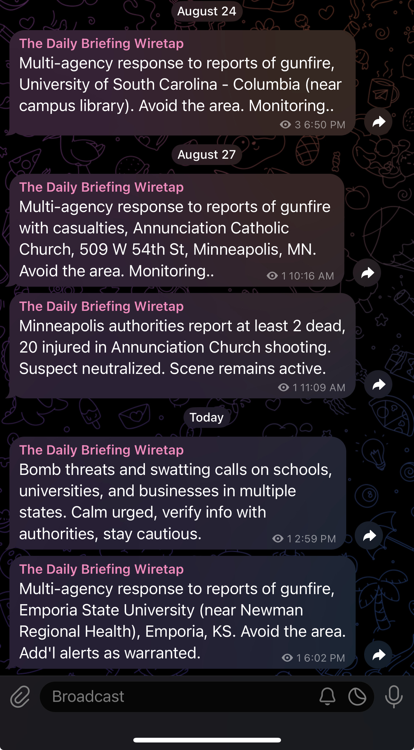 Pre-mainstream alerts on attacks, threats, and federal moves.