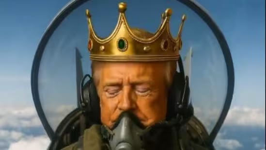 The protest crowd called him a monarch. He called their bluff — and turned their crown into a meme strike from 30,000 feet.