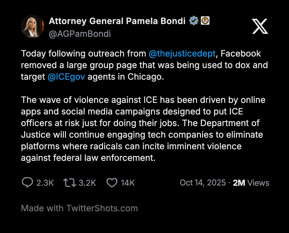 Attorney General Pam Bondi confirmed Tuesday that Meta took action “following outreach from the Department of Justice,” after investigators discovered a Chicago-based group was sharing ICE agents’ names, faces, and locations online — the digital equivalent of painting a target on their backs.