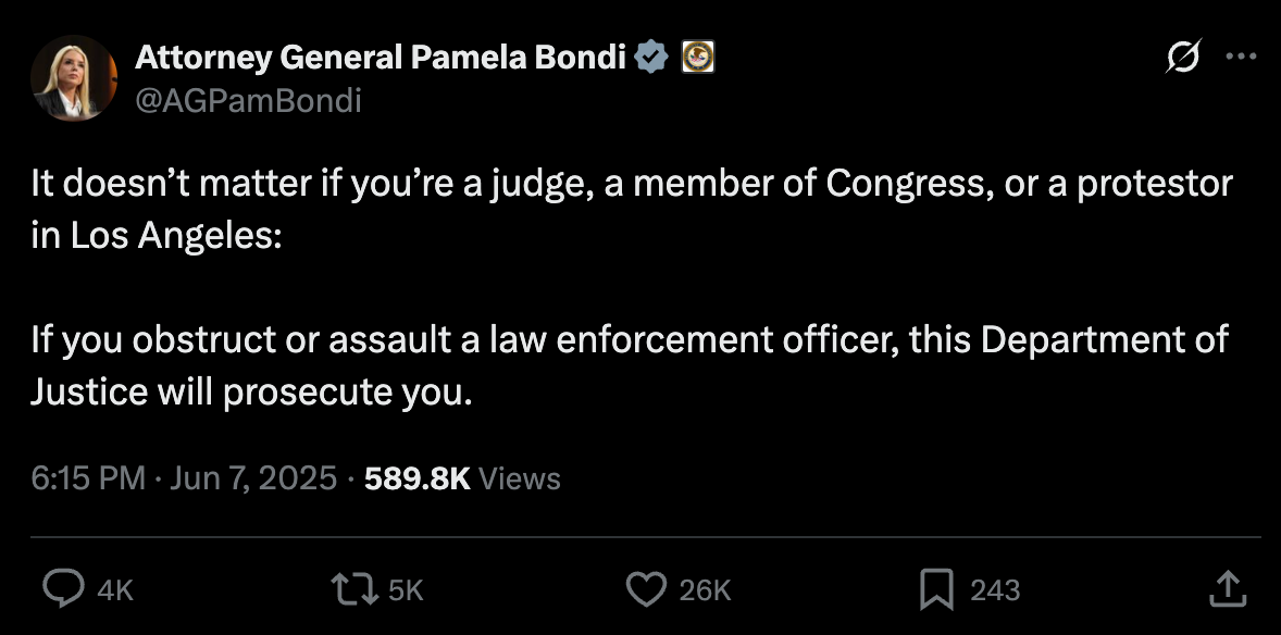 “It doesn’t matter if you’re a judge, a member of Congress, or a protestor in Los Angeles: If you obstruct or assault a law enforcement officer, this Department of Justice will prosecute you,” she said in a statement that sent a clear message—there will be no sanctuary for violence.