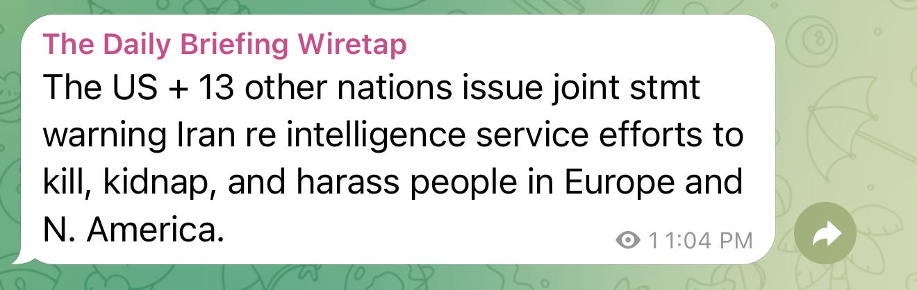 Yesterday, our paid members got a real-time Wiretap alert the moment 14 nations—including the U.S.—issued a joint warning about Iranian intel ops targeting people for kidnapping and murder in Europe and North America. These aren’t hypotheticals anymore. The war isn’t coming. It’s here.