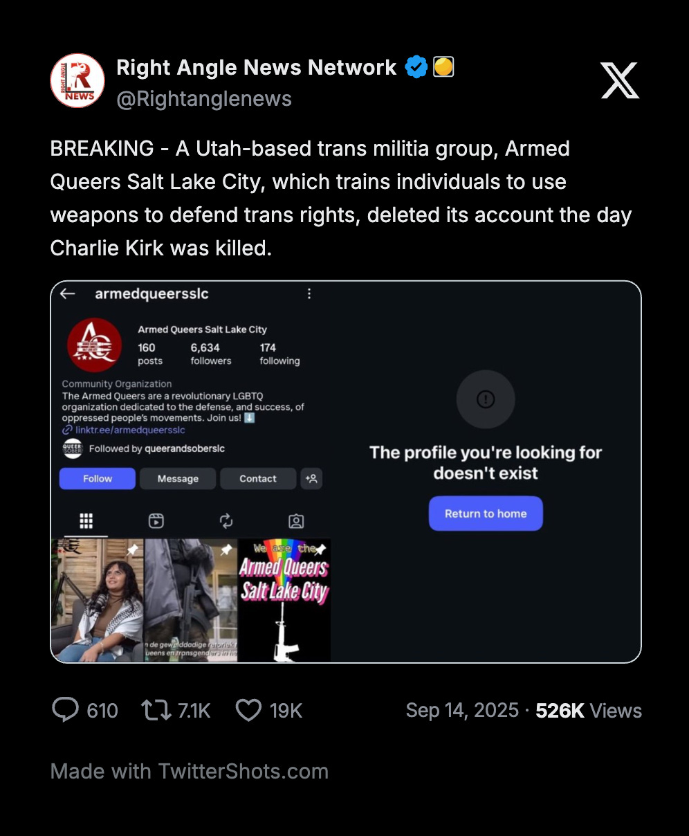 Federal investigators aren’t just chasing Robinson’s search history. They’re mapping his networks. Steam gaming circles. Pro-trans paramilitary groups in Utah. A militia outfit calling itself Armed Queers SLC — gone dark the same day Kirk was assassinated. Profiles erased. Signals cut. That’s not grief. That’s cleanup.